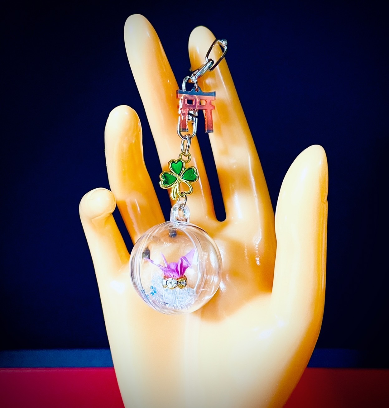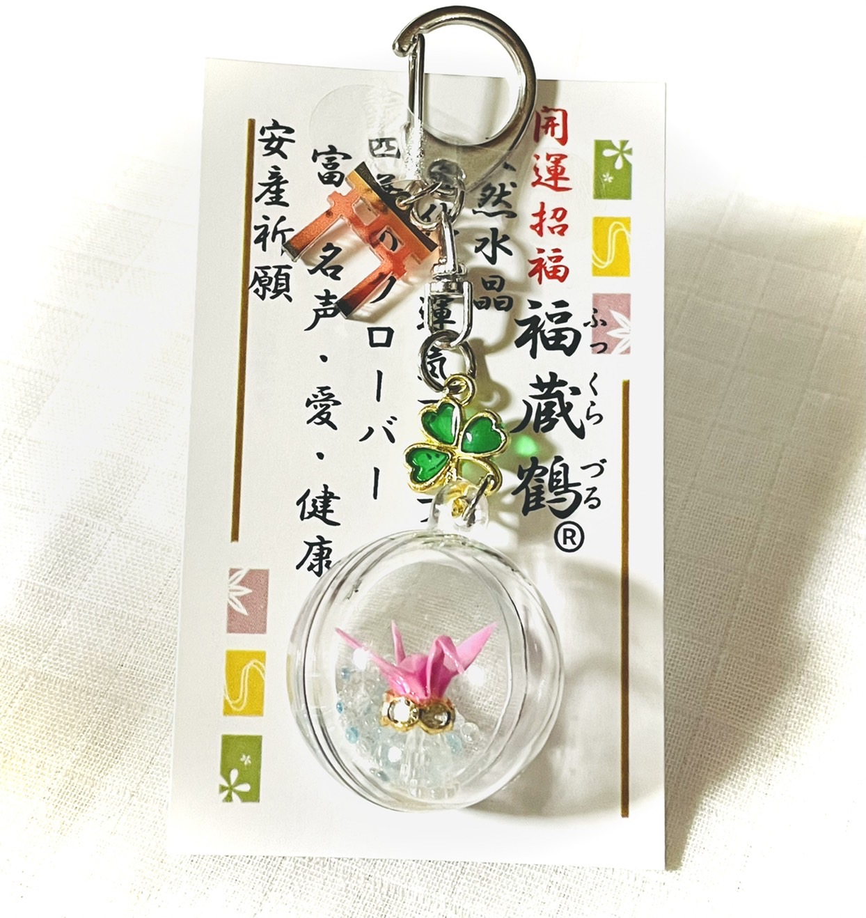 「心を込めて手作りした折り鶴」と「水晶」をふっくらとしたまんまるカプセルで包みました。四葉のクローバーは幸運の象徴。鳥居は女性を表しているという説もあり、女性の神秘性を尊ぶものでもあります。出産の勇気づけ、応援、安産祈願に。