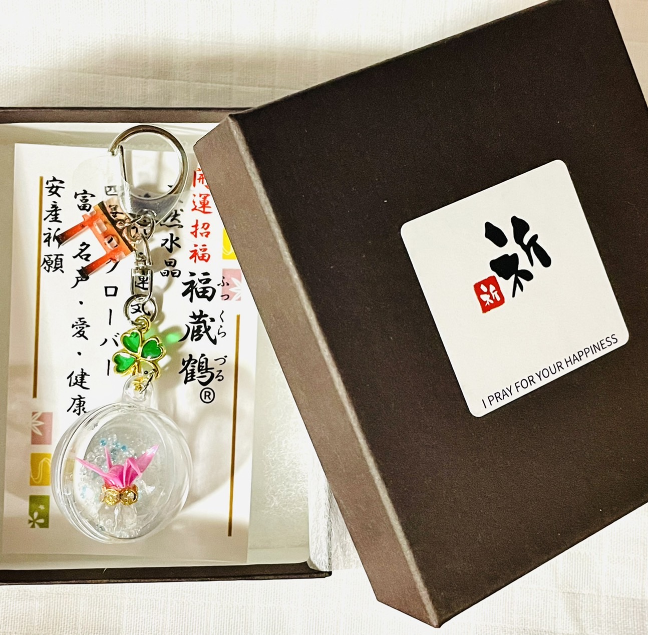 安産祈願プレゼント箱入り 折り鶴ギフト福蔵鶴(ふっくらづる)キーホルダー ピンク 桃色 四葉のクローバー 鳥居 参道 産道 生命の誕生 女性 妊婦さんへのプレゼント 出産応援 出産見守り 出産守り