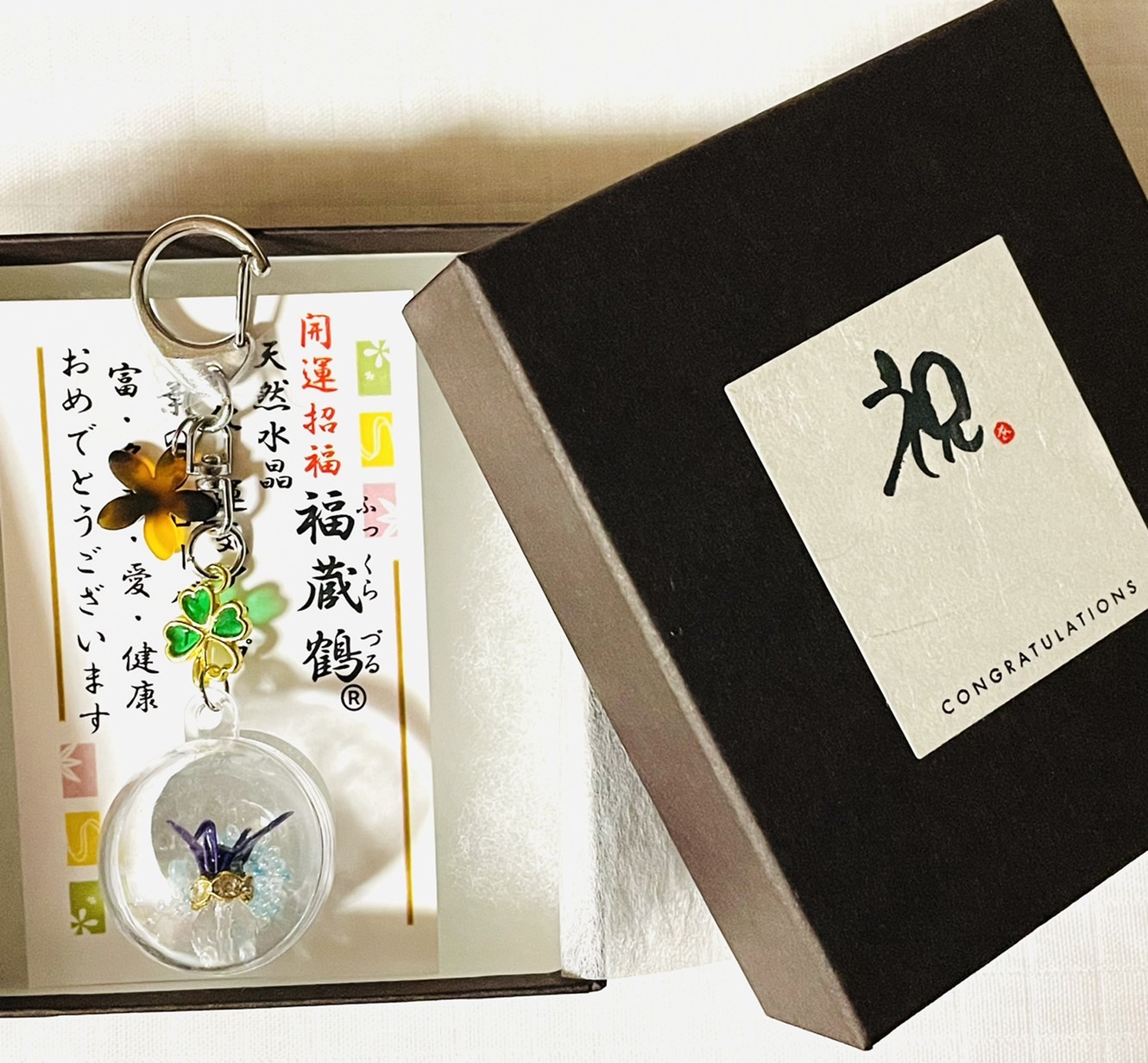 長寿のお祝いプレゼント箱入り 折り鶴ギフト福蔵鶴(ふっくらづる)キーホルダー 白色 四葉のクローバー べっ甲調花 卒寿90歳誕生日祝い 白寿99歳誕生日祝い 紀寿100歳誕生日祝い
