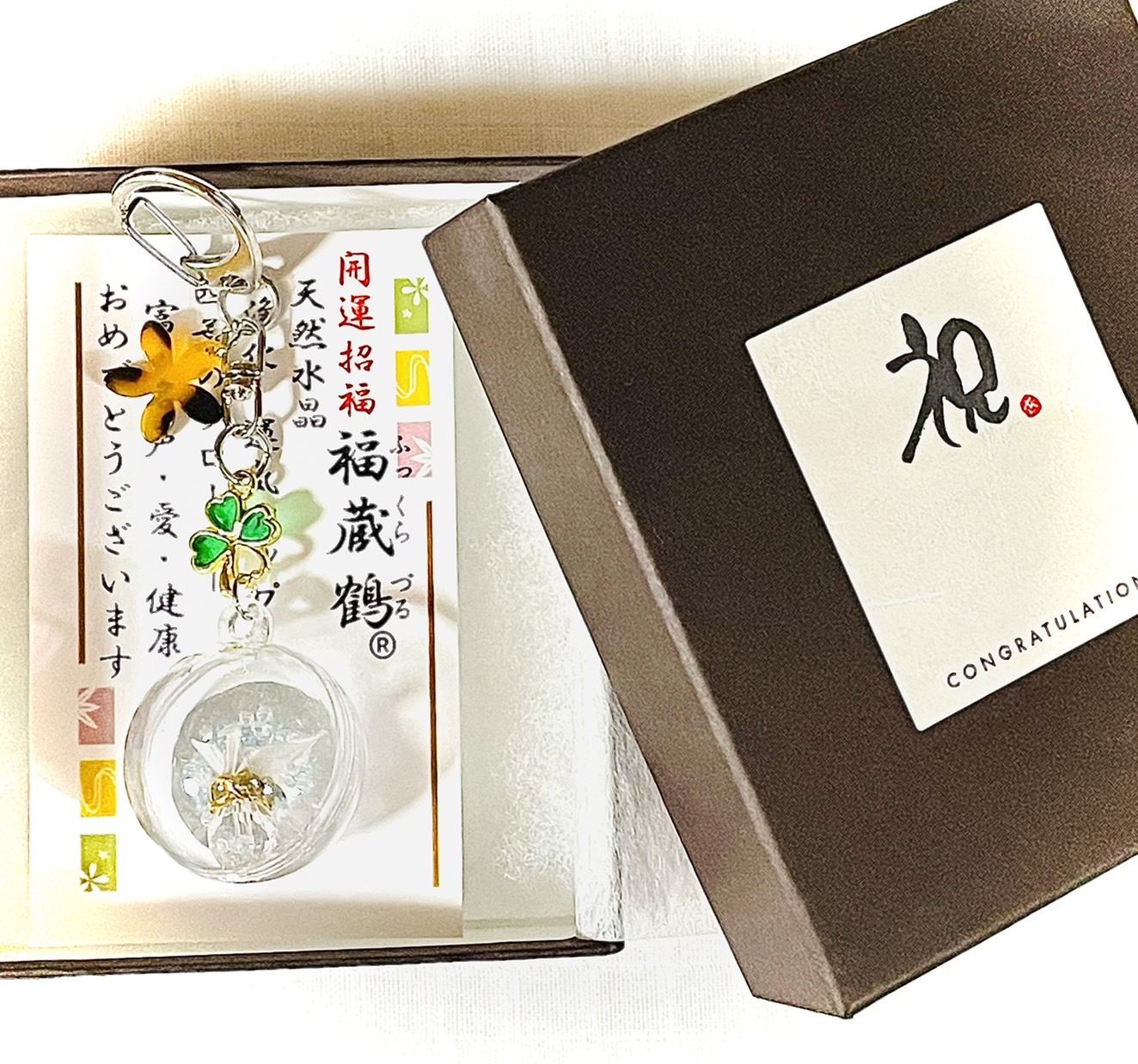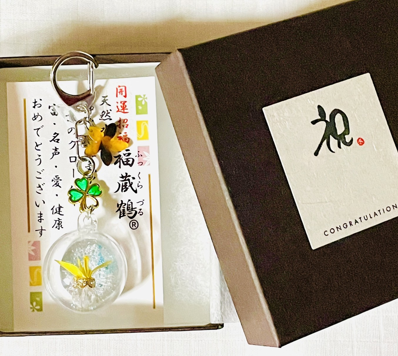 長寿のお祝いプレゼント箱入り 折り鶴ギフト福蔵鶴(ふっくらづる) キーホルダー 黄色 四葉のクローバー べっ甲調花 傘寿80歳誕生日祝い 半寿81歳誕生日祝い 米寿88歳誕生日祝い 誕生日プレゼント