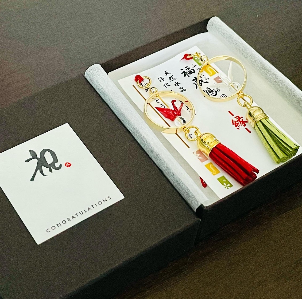 日本の伝承文化である縁起物の「折り鶴」が、それぞれの色の意味を持ち、浄化・癒し・強化・調和のパワーのある「水晶」の上でその力を発揮。銅製の円形フレーム=円=縁を意味し、赤色の根付で運命の赤い糸を表現。ふっくら(福蔵)とした小さくかつ大きな福音(=喜ばしい良い知らせ)がこの作品を持つ人々に訪れることを願って制作。