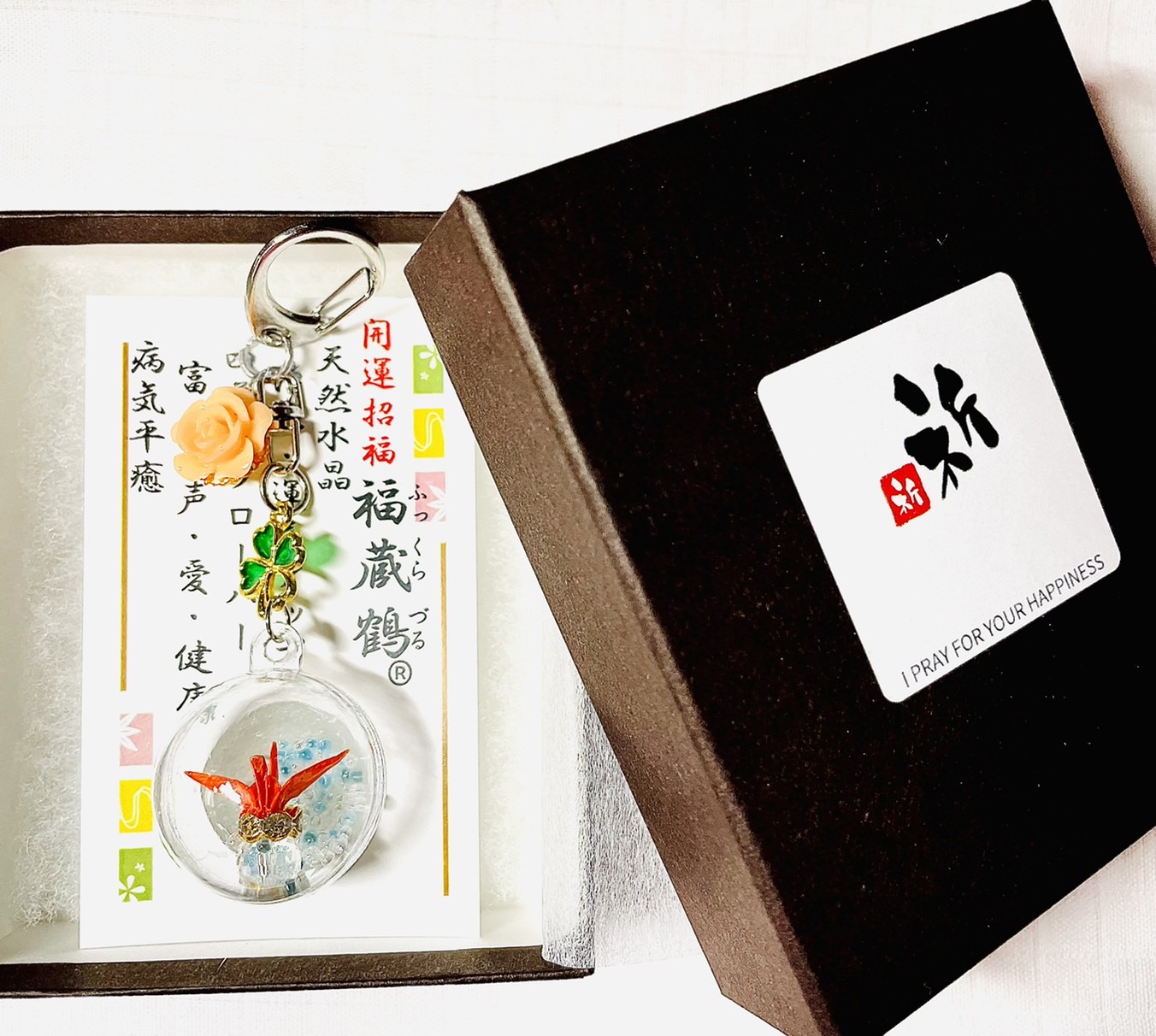 「心を込めて手作りした折り鶴」と「水晶」をふっくらとしたまんまるカプセルで包みました。四葉のクローバーは幸運の象徴。オレンジのバラの花言葉は絆、健やか、幸多かれ。箱入り。お見舞いのプレゼントに。